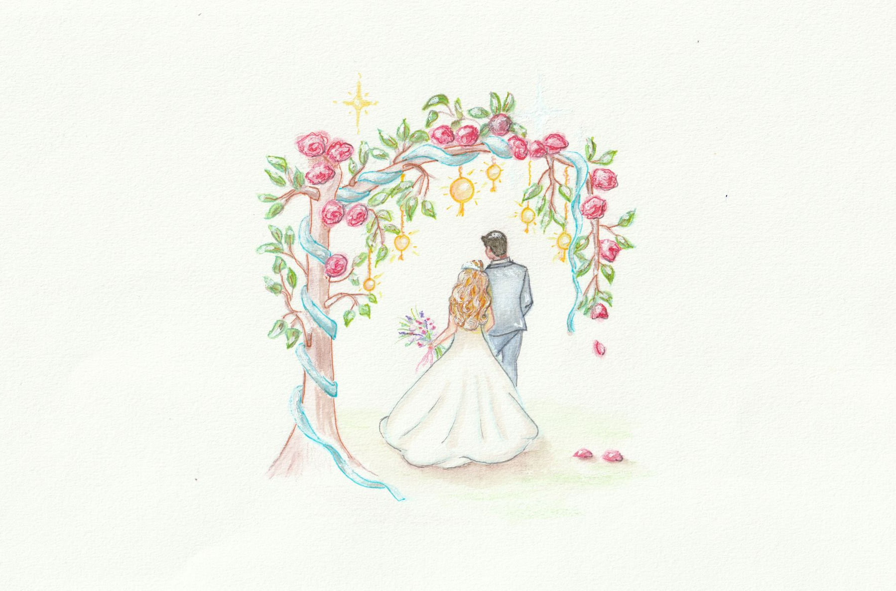 De tekening op de uitnodiging is gemaakt door Sandra Jansen, de moeder van Debbie. We wilden graag iets persoonlijks en romantisch op de kaart en haar creatieve talent paste hier goed bij. Daarom hebben we gevraagd of zij voor ons iets wilde ontwerpen. Wij als bruidspaar samen en iets met bloemen waren elementen die wij graag terug wilden zien. Zij heeft hier zelf nog een klein sterretje (te zien links boven de boom) aan toegevoegd, als symbool voor Jasper.
